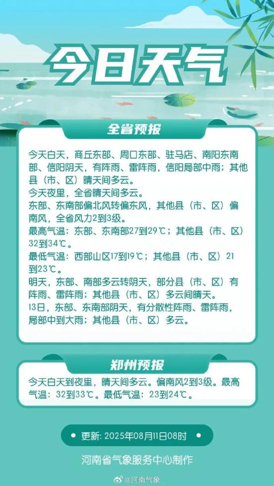 8月11日,记者从河南知足了解到,今天白日,商丘东部、周口东部、驻马店、南阳东南部、信阳阴天,有阵雨、雷阵雨,信阳局部中雨;其他县(市、区)好天间多云。今天夜里,全省好天间多云。东部、东南部偏北风转偏东风,其他县(市、区)偏南风,全省风力2到3级。最高气温:东部、东南部27到29℃;其他县(市、区)32到34℃。最低气温:西部山区17到19℃;其他县(市、区)21到23℃。